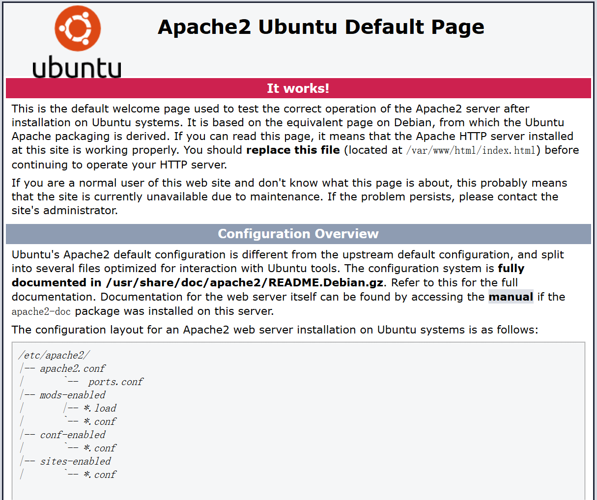 安装完成后可以通过访问服务器地址查看是否出现Apache2 Ubuntu Default Page并显示It works.